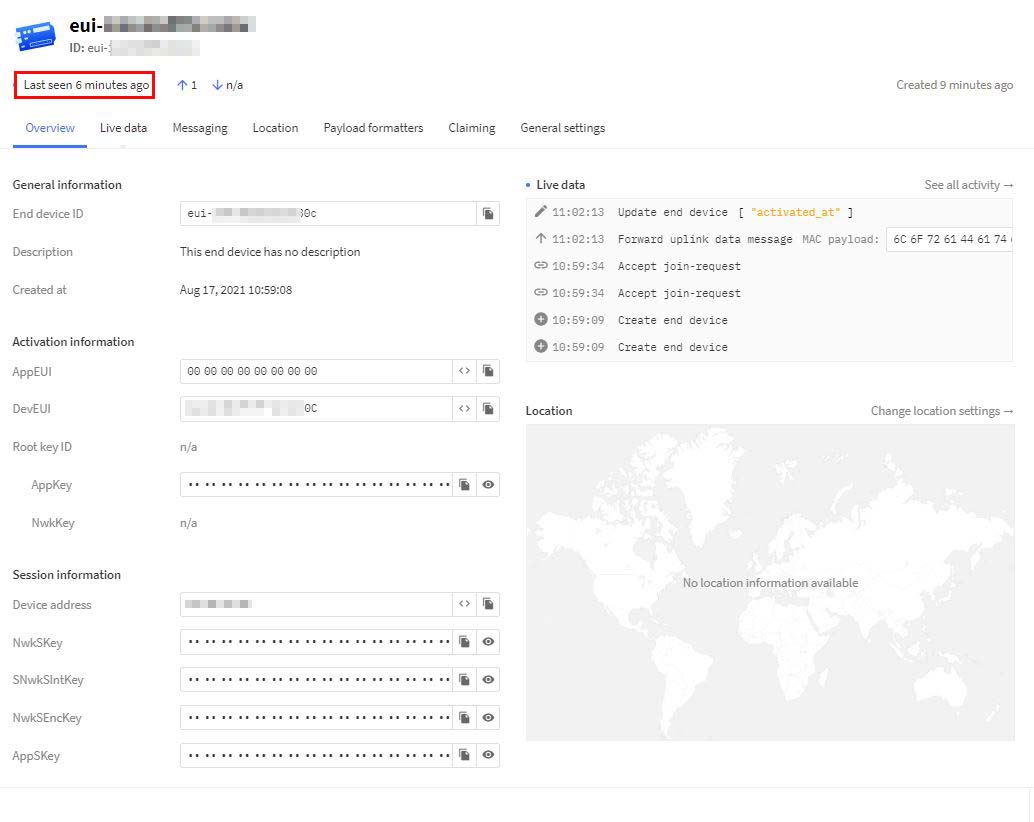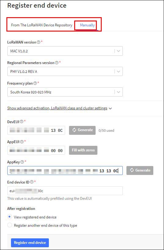 ▲ 로라 저장소에는 내가 사용하는 로라 모듈에 대한 정보가 없이 때문에 Manually를 선택하고 각각의 정보를 입력해준다. 이렇게 End Device를 등록하고 로라 상태를 확인해보면...