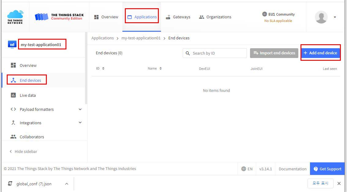 ▲ 현재 Application 이름만 설정해서 만들어놓은 상태라서 아무 역할도 하지 못한다. 이제 데이터를 이 Application으로 전송할 End Device를 등록해주자.