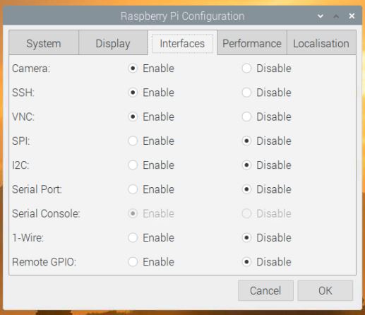 그리고 Interfaces 를 선택한 후 사용하려는 인터페이스를 Enable 해주면 된다. 나는 카메라와 SSH, VNC를 선택한다.