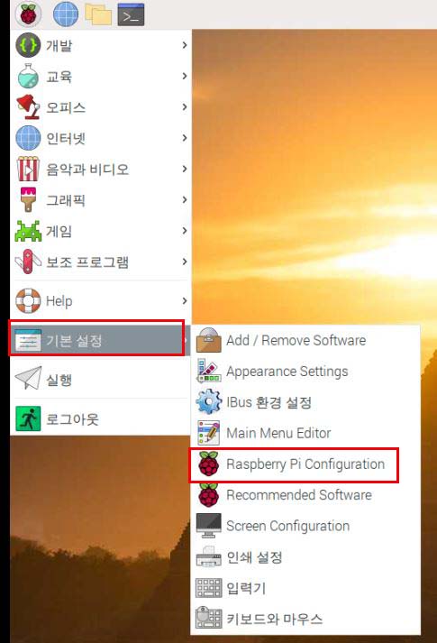 라즈베리파이 메뉴 중에서 [기본 설정 > Raspberry Pi Configuration]을 선택한다.