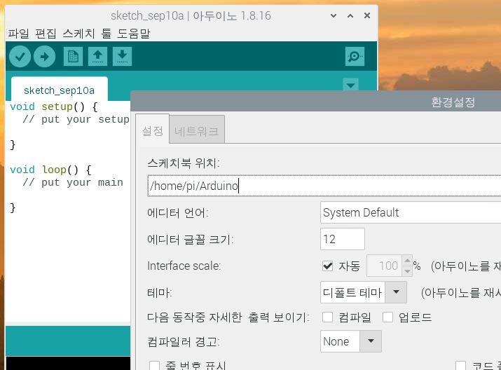 스케치북의 위치는 /home/pi/Arduino 폴더이며 이 안에 Libraries 폴더가 있으니 필요한 라이브러리는 이곳으로 옮겨놓고 사용하면 될 것이다.