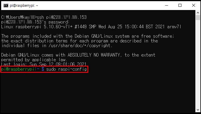 ssh로 로그인 한 후 [sudo rasp-config]로 라즈베리파이4 설정 메뉴를 실행한다.