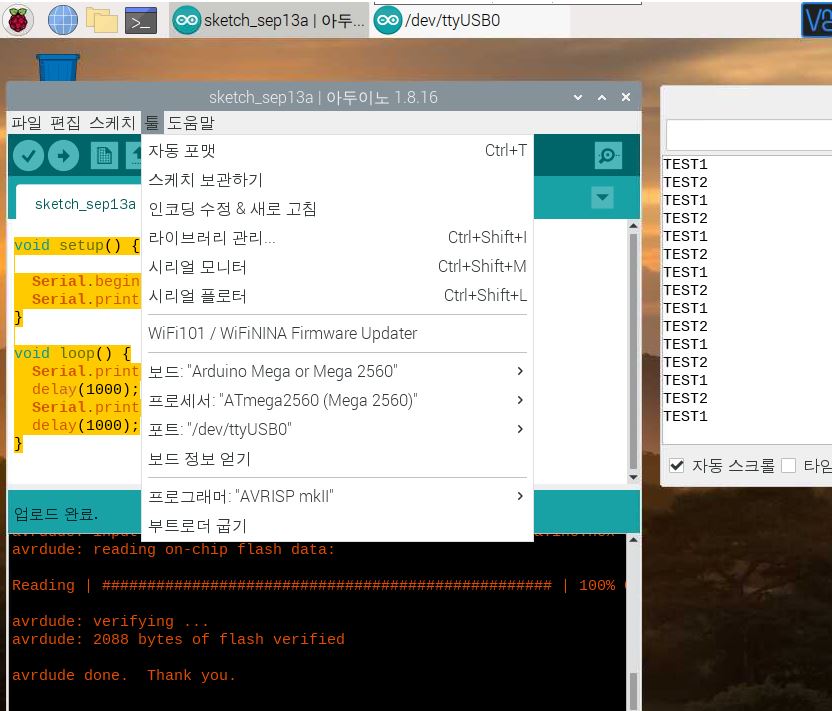 시리얼 포트를 통해 코드를 올리고 메시지 출력 완료.