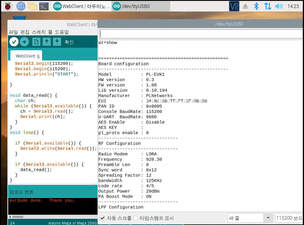 - PLM100 LoRa 모듈의 현재 설정값들을 보여주는 at+show 명령어를 통해 모듈을 상태를 확인.