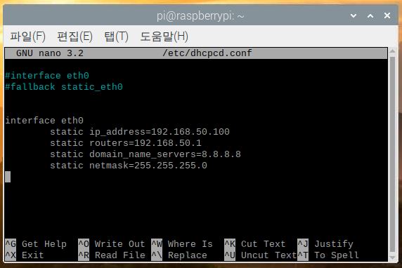 [/etc/dhcpcd.conf] 파일에 다음의 내용을 추가하고 아래와 같이 아이피를 확인한다.